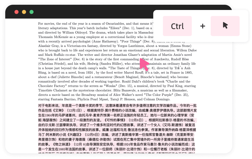 沉浸式翻译带来了又一次革命性的交互创新——鼠标悬停翻译。只需将鼠标悬停在任意段落,同时按下预设的快捷键(如Ctrl),当前段落的译文便会立即呈现在段落之后。